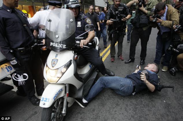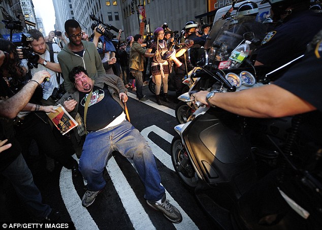 I thought it was funny at first, but maybe these people out in Wall Street have a point, if there is no money, no jobs, and nothing better to do? Turns out that guy in the picture getting run over by a scooter is actually a lawyer.Here is someone who is educated, who went to school, and is there on the street willing to get run over for his cause. Maybe he's the Captain America of the modern age?